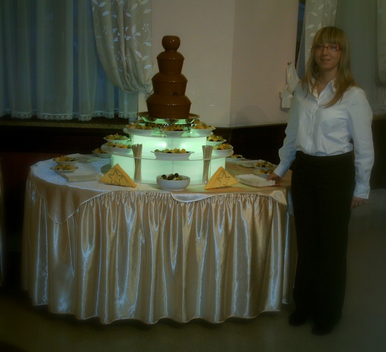 Oferujemy Państwu wynajem profesjonalnej czekoladowej fontanny marki Giles & Posner wraz z podświetlanym podestem emitującym 7 kolorów światła w 3 programach świecenia!